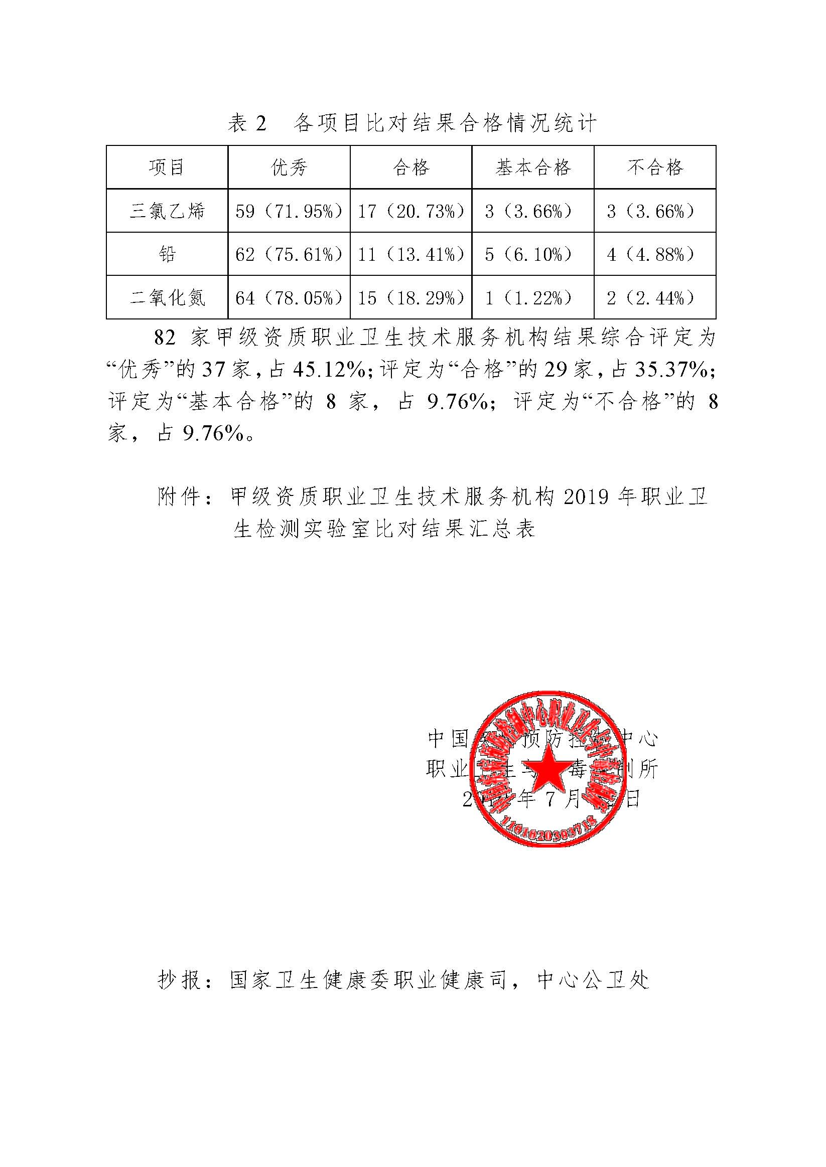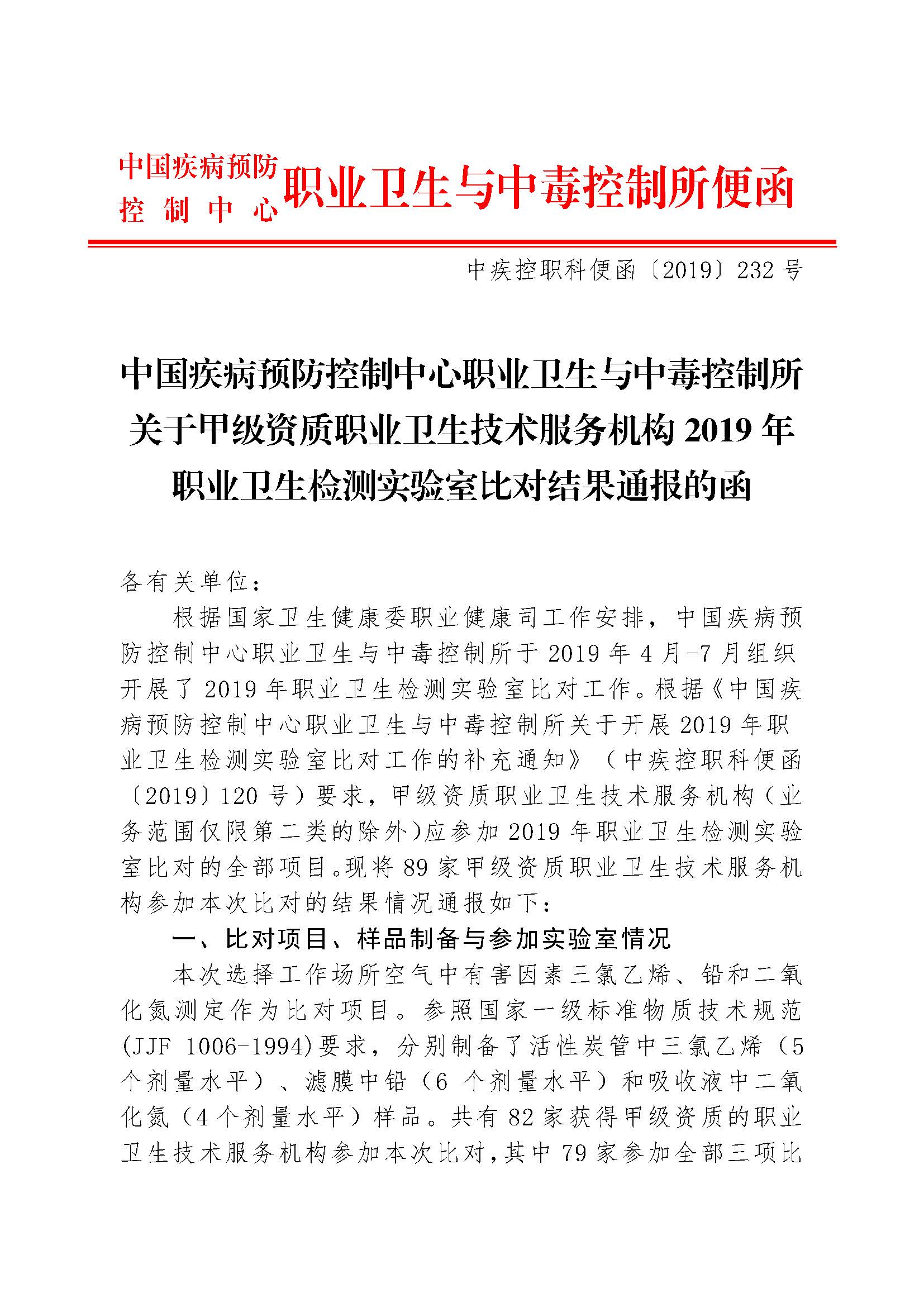 关于甲级资质职业卫生技术服务机构2019年职业卫生检测实验室比对结果通报的函
