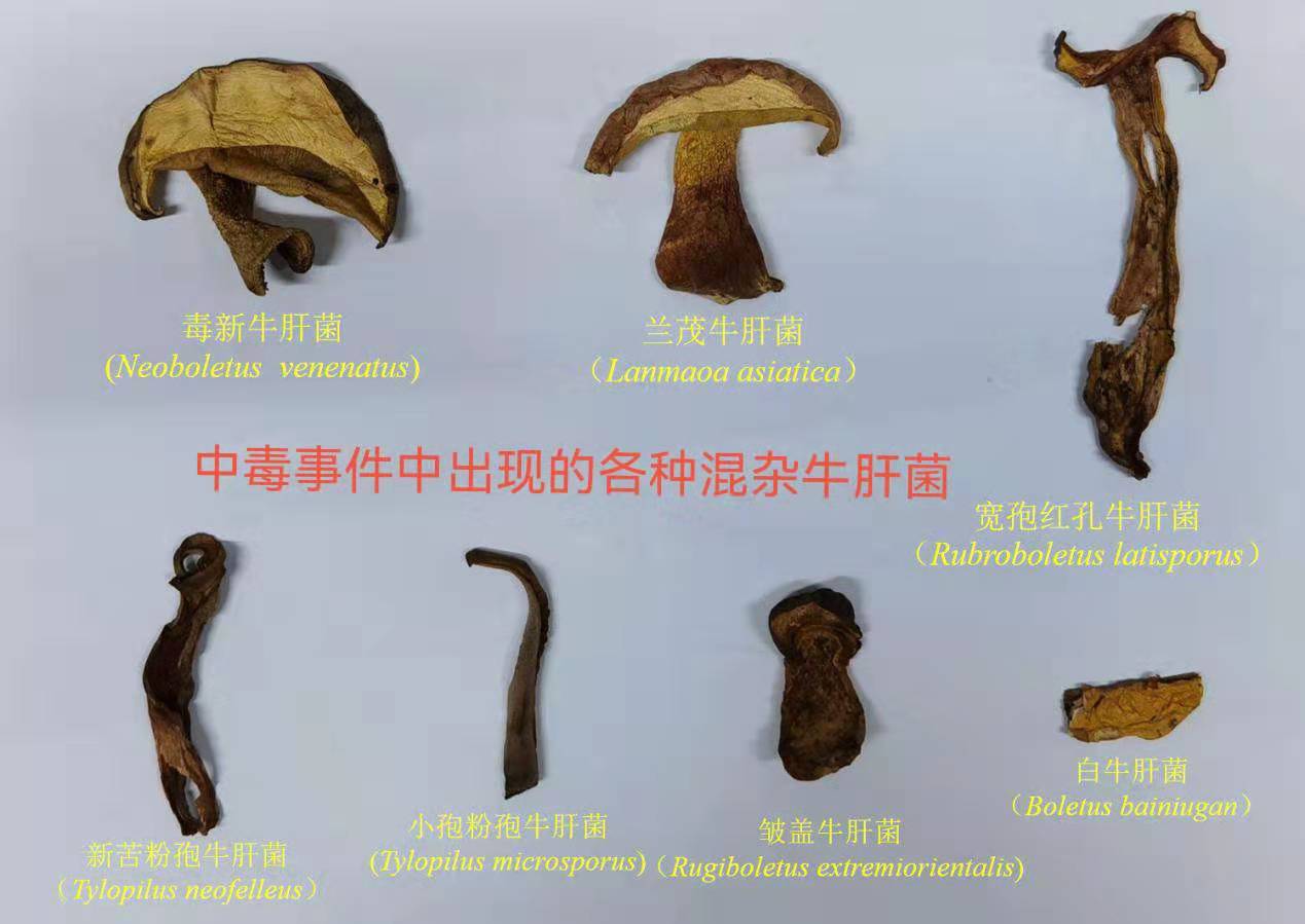 分辨牛肝菌的是件硬核的技术活,不是谁都能胜任的。新鲜牛肝菌可能采菌或卖菌的“老司机”还能分辩个一二,但晒干后就难了,只能通过分子生物学鉴定,才能分出个子丑寅卯。从既往干的牛肝菌中毒样品中可见,一盘炒干牛肝菌中可能包含几种或十余种牛肝菌,有毒的和可食的混杂在一起。所以,进食干的牛肝菌中毒的机率要比进食新鲜的牛肝菌大!