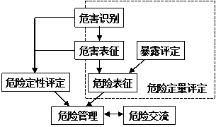 危险分析(Risk Analysis):对机体、系统或人群可能暴露于一种危害的场景的分析与控制过程。危险分析由三部分构成,即危险评定、危险管理和有关危险的信息交流。危险管理(Risk Management)考虑了与危害信息相关的危险评定信息及其有关联的政治因素、社会因素、经济因素和技术因素的决策过程,以发展、分析和比较各种法规和非法规选项,并针对危害选择和实行适当的管理反应。危险交流(Risk Communication)是在评定者、管理者、新闻媒体和一般公众之间关于(健康或环境)危险的信息的相互交换。危险分析的最终目的是预防和控制健康风险,使人类社会逐步达到健康状态。危险评定用于危险管理,危险管理决策是在危险信息的反复交流过程中形成并得以实施。危险评定、危险管理和危险交流三者之间的关系见下图。